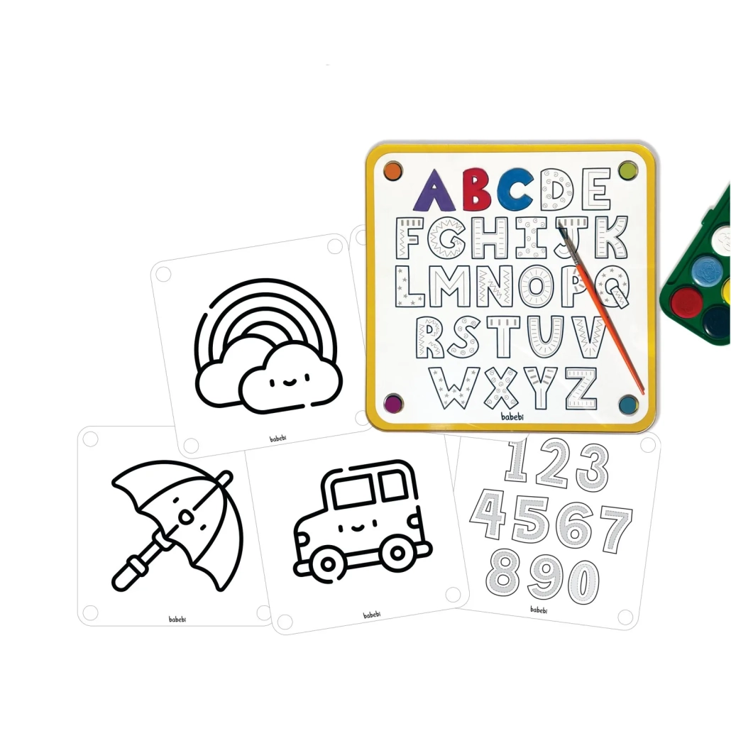Contém 1 tabuleiro Pinte e Apague, 1 paleta de aquarela 12 cores e pincel e 6 desenhos diversos.