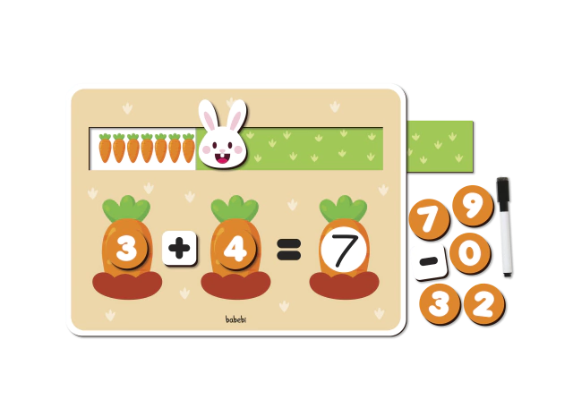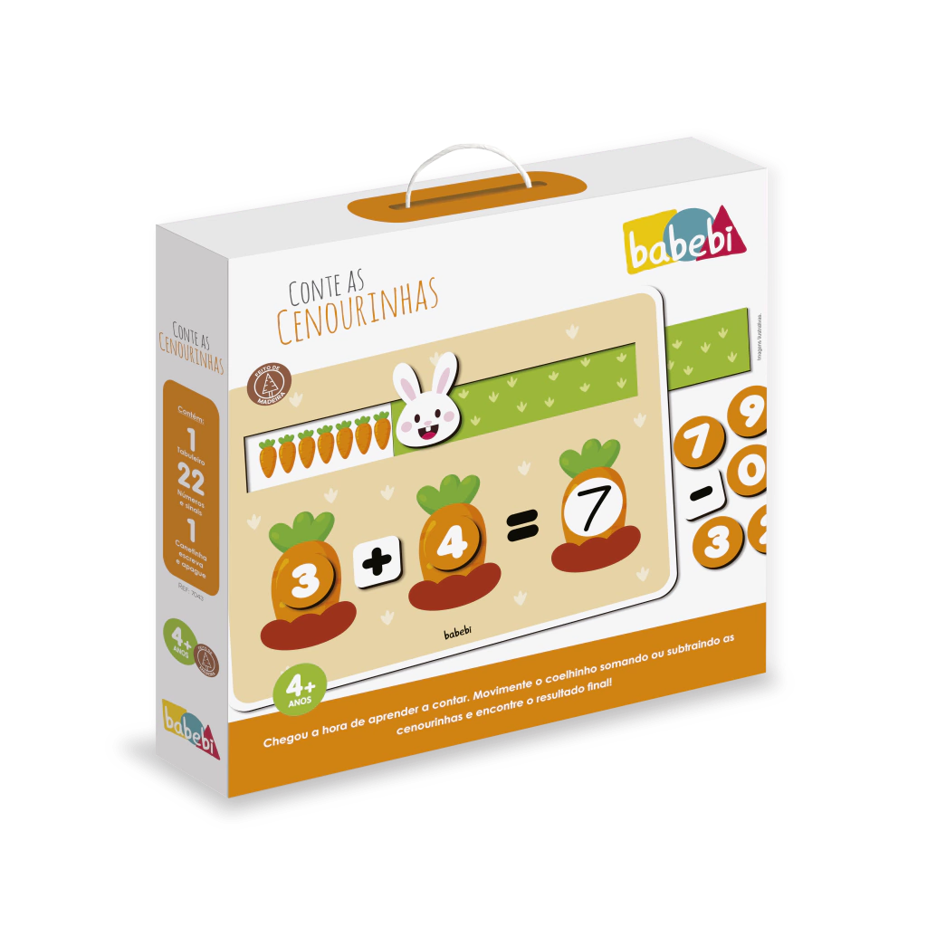 Aprenda a contar de forma divertida! Movimente o coelhinho, somando ou subtraindo as cenourinhas para encontrar o resultado final.