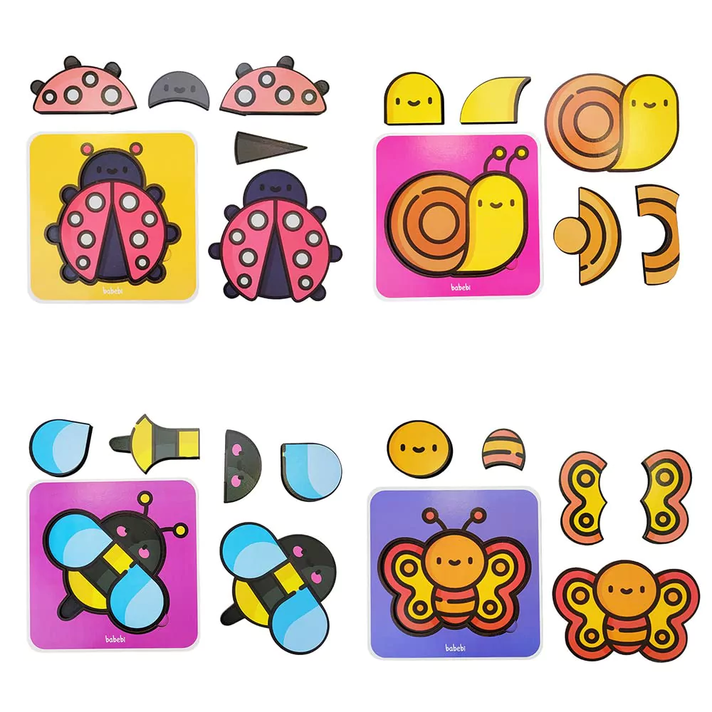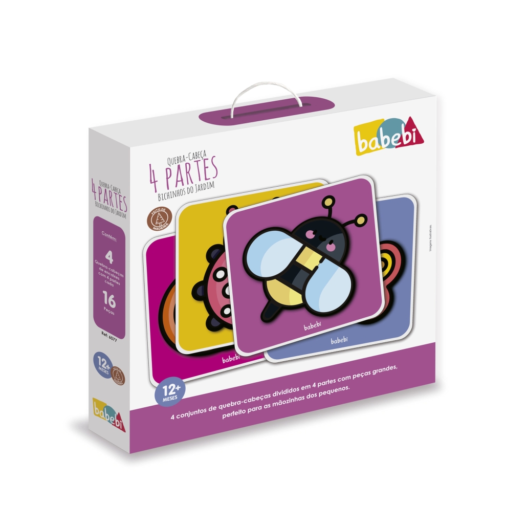O Quebra-Cabeça 4 Partes Bichinhos do Jardim são 4 conjuntos de quebra-cabeças de encaixe divididos em 4 partes com peças grandes, perfeito para as mãozinhas dos pequenos. Montar um quebra-cabeça é um desafio e tanto para as crianças, na qual exercitam o raciocínio lógico e a atenção de maneira lúdica e criativa. Tema Bichinhos do Jardim (abelha, borboleta, caracol, joaninha).