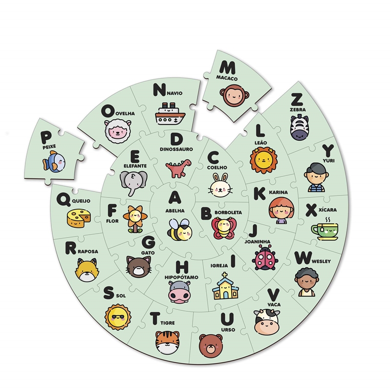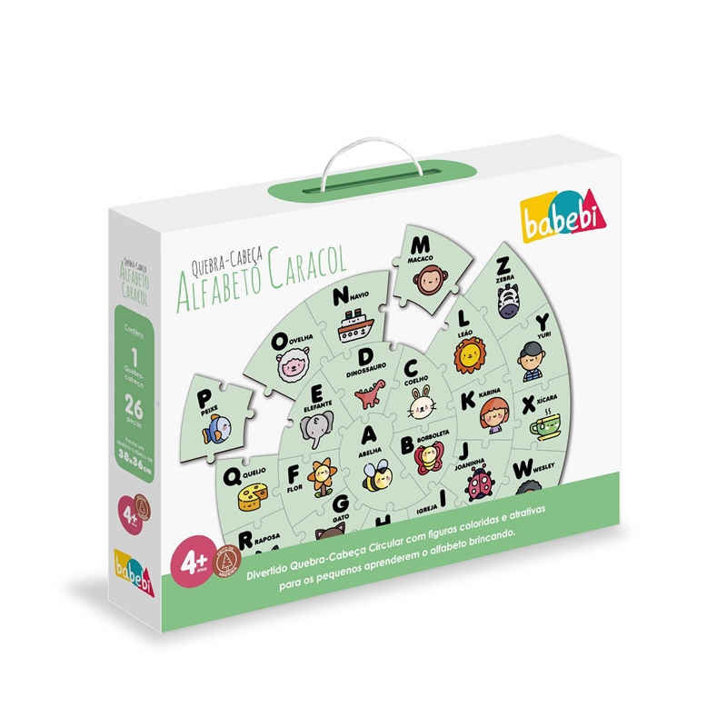 O Quebra-Cabeça Alfabeto Caracol é um divertido quebra-cabeça Circular com figuras coloridas e atrativas para os pequenos aprenderem o alfabeto brincando.