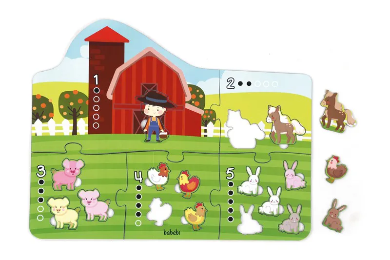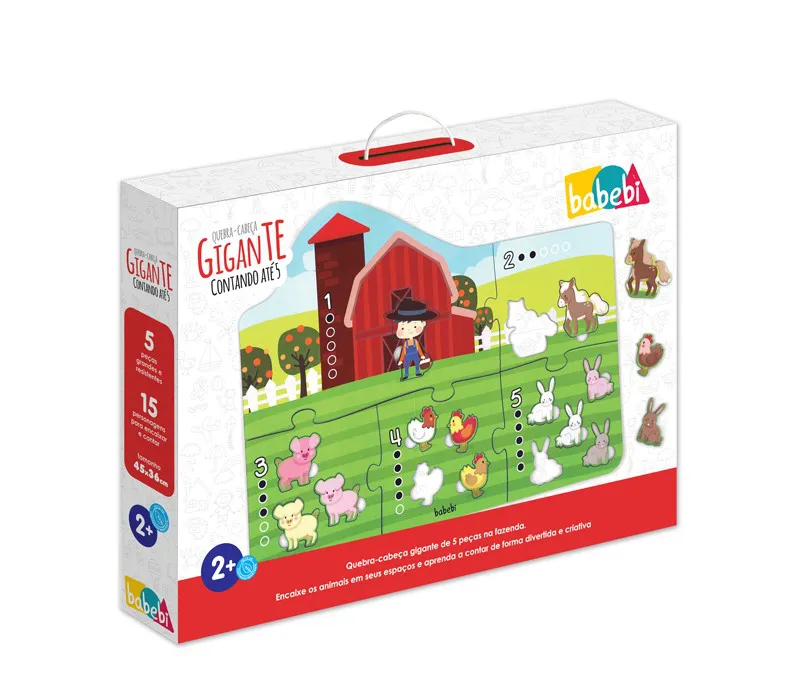 Um quebra-cabeça gigante e diversas pecinhas. Com o Quebra-Cabeça Gigante Contando Até 5 as crianças encaixam os personagens da fazendinha e aprendem a contar até 5 de maneira lúdica e criativa.
